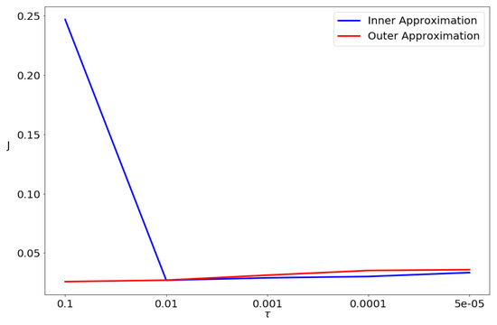 The probability function usually does not have a closed form analytic representation. Except for special types of sets , it is generally difficult to directly evaluate the integral on the right hand-side of Equation (18) to obtain the value of for a given u. Furthermore, can be non-differentiable, non-convex, and commonly guaranteeing the feasibility of an optimal solution is not trivial. Moreover, the theoretical assumptions for the differentiability of are quite restrictive and also the knowledge of its differentiability furnishes little computational advantages. Therefore, to overcome these difficulties, we use our recently proposed smoothing inner–outer approximation strategy [47]. The viability of this approximation strategy has been demonstrated for both finite [47,48] and infinite dimensional [20] CCOPT problems. Here, we extend the inner–outer approach for the solution of chance constrained MPC problems for parabolic PDE systems. Using this method, we guarantee the feasibility of the state trajectories in MPC, despite the presence of uncertainties and, in particular, without requiring an extra effort for constructing a probability tube.
