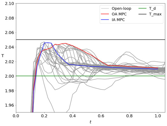 Furthermore, problems and are solved in a double loop: in the first loop over the initial time instance , updated by Equation (7), and in the second loop over decreasing values of . To speed up the computation, we use parallel computing for the finite element code by spreading the solution calculations of the PDE system for each realization of and by allowing function evaluation and gradient computation over several processor threads through the MPI standard. It is also worth noting that MPI is the only method that allows running such Dolfin-Adjoint finite element code in parallel. Finally, on each prediction horizon, the resulting NLP problems are solved in parallel by the primal-dual interior-point method (the IPOPT library [68]) with the parallel linear solver HSL_MA97 to obtain optimal control sequences. The solution is used as an initial guess for the optimization on the next prediction horizon, which means a so-called warm MPC strategy.