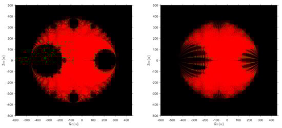 We can perform a stability analysis of the MCCT() family by representing dynamical planes of the rational operators and . Two values of with different behavior in the parameter space of Figure 1 have been chosen; value is in the red zone, which implies convergence, while value is in the black zone, which does not guarantee convergence. These parameter spaces were obtained from the MCCT() family for scalar cases [9], with their results then extrapolated for vector cases.