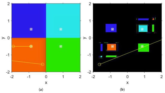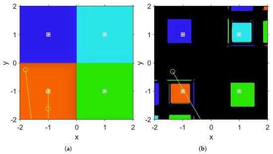 Dynamical planes for : (a) convergence to for and an initial estimation close to the roots; (b) no convergence to any for and an initial estimation close to the roots.
