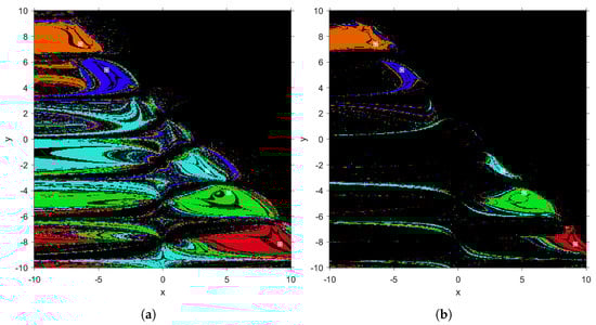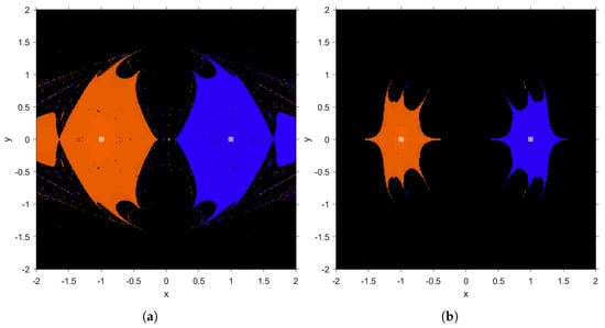 Dynamical planes for system : (a) considering the MCCT(0) method and (b) considering the MCCT(200) method.