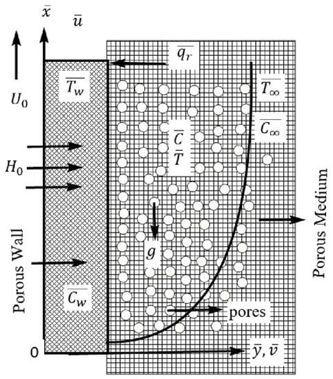 In the fields of technology and applied science, including filtration, environmental mechanics, and chemical science, the porosity idea is used. There are differences between intercrystalline and intergranular porosity in the cavern and molecular interstices. As a result, both academic study and processing technologies have given porous media a lot of attention. The rigid matrix, porous structure, and matrix permeability are the primary determinants of the properties of the medium, including permeability, thermal conductivity, and thermal capacitance. In the study and design of heat transmission and heat exchanging devices, porous media and transfer are becoming increasingly appealing. When a fluid moves through a porous medium, it originates into touch with its sizable surface area and the fluid’s rate of heat exchange is accelerated due to the medium’s convoluted structure. Additionally, porous media are used to increase fluid thermal resistivity and to calm or heat liquids. Ahmad and Pop [32] investigated how suction affected the buoyancy phenomena caused by NF implanted in a permeable medium on a flat vertical plate, and established double solutions. Sheikholeslami et al. [33] examined the effects of the electromagnetic field on the liquid flow containing NF implanted in a source of porous medium. They investigated NF in porous media via the cavity using the KKL method and Darcy models. A study reported by Bakar et al. [34] examined mixed convection radiation flow across a tube comprising NF generated in a porous medium. Applying the Brinkman–Darcy model to study the entropy and slip characteristics of heat transport in a closed form was developed by Turkyilmazoglu [35]. More information on the studies of nanofluids are provided in [36,37].