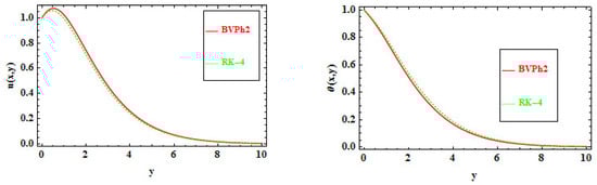 The systems of nonlinear Equations (17), (20) and (21) were solved computationally by using the RK4 method. First, the PDEs were converted to ODEs by introducing the similarity transformation. In the next step, the nonlinear ODEs were altered to first-order ODEs by introducing new variables, and lastly, the RK4 code was developed in MATLAB and numerical results were obtained through graphs and tables. The procedure of the RK4 is given in Figure 2. For the RK4 method, firstly a specific value for was estimated. Two different estimations were created and assessed at each phase. The assumption was accepted if the solution was satisfied. For the existing work, the step size was = 0.01 and accuracy 10−4. For validation of the numerical code, Mathematica package BVPh2 was also used and excellent correlation was found as illustrated in Figure 3.