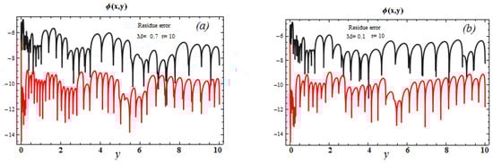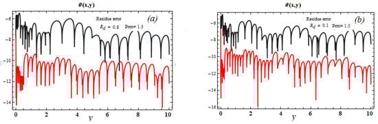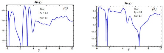 Before making any physical predictions, we first performed an error analysis to ensure that the procedure was legitimate. Figure 4, Figure 5, Figure 6 and Figure 7 are designed with this end in mind. During the solution, the RK4 package’s minimal error 10−30 was fixed. We used Mathematica module ND-Solve to minimize the total average squared residual error (ASRE). We initially modified the thermal radiation factor and fixed and to observe error for numerous orders of approximation. The greatest ASRE at various interpolation orders is shown in Figure 2 and Figure 4. In Figure 1, it is seen that for , the total ASRE and ASRE decrease as the order of approximation increases. Additionally, for , the error is streakily decreasing as compared to the cases for as shown in Figure 5. By changing the magnetic parameter and setting similarly distinct plots are given in Figure 3 and Figure 4, respectively. Averaged squared residual errors and total averaged squared residual errors both decrease for and as the order of approximation increases. It is also observed that for , the error is streakily reducing in relation to the cases for and as shown in Figure 6 and Figure 7.