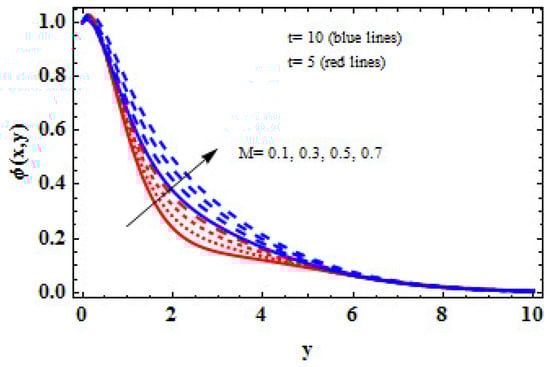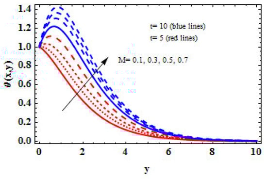 For various values of magnetic Prandtl number (MPN), the influence of TR parameters (TRP) on the temperature distribution is depicted in Figure 8. The temperature profile of the viscous liquid appears to grow as the TRP increases. An elevation in electromagnetic waves in the channel is due to higher radiation values. The presence of magnetic field electromagnetic waves will produce more heat in the fluid. Additionally, larger MPN corresponds to higher temperatures as shown in Figure 8. Figure 9 depicts the dependence of temperature on the magnetic field parameter. This analysis was performed for different times, i.e., for and . Due to the existence of a radiation influence on the fluid flow, an increment in magnetic field will enhance temperature distribution. The graphical representation acknowledges that as time passes, additional electromagnetic waves are released and the temperature rises.