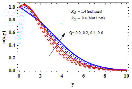 For two dissimilar values of MPN, i.e., and , Figure 12 illustrates velocity variation for different values of TRP. The increase in MPN and heat radiation decreases the velocity of a chemical reaction’s survival. It is observed that the flow rate is greater near the surface and consciously decreases with the growing values of It is also witnessed that for higher values of MPN the velocity variation is smaller compared to the small value of MPN. The dual performance is detected for the heat source factor on the velocity for different values of thermal radiation as portrayed in Figure 12. The point of interest is that the liquid flow velocity increases as the heat source factor increases, relative to the magnetic field. However, at the start of the channel, velocity is higher for higher quantities of heat radiation, but as the channel progresses, velocity decreases owing to the applied magnetic field.