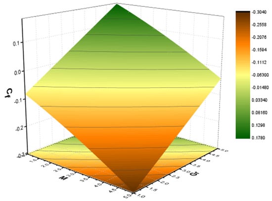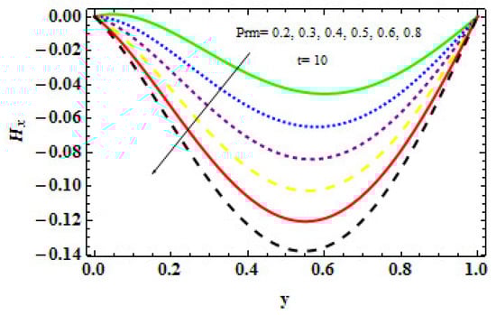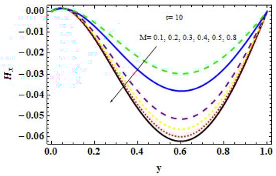 The consequence of a magnetic factor over the applied magnetic field at a given time is shown in Figure 13. Since they oppose each other, the resultant magnetic field effect declines as the magnetic factor is enhanced. Figure 14 shows the consequence of MPN on the induced magnetic field for the given time. It is observed that the influence of MPN on the IMF is the same as shown in Figure 13.