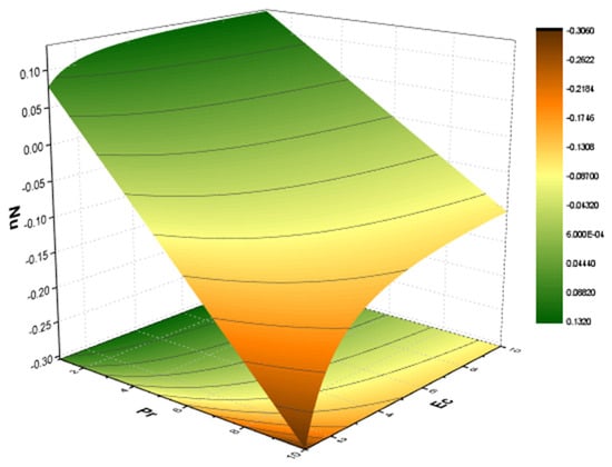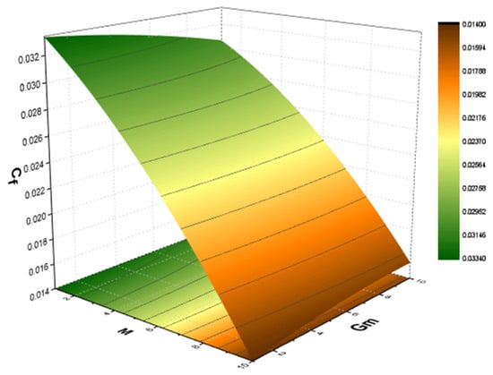 The influence of the physical parameters skin friction (SF), local density current (LDC), and Nusselt number (NN) on the physical quantity of interest are shown in Figure 15, Figure 16, Figure 17, Figure 18, Figure 19, Figure 20 and Figure 21. Figure 15 and Figure 16 display the impact of , and on SF. It is observed that the SF declines as is increased and the opposite behavior is detected for the growing values of . Similarly, the impact of , and on the LDC and NN is presented in Figure 17 and Figure 18, respectively. It is observed that with increasing , and , the LDC and NN enhance with the growing values of these physical parameters. The impact of and on the NN and Sherwood numbers is depicted in Figure 19 and Figure 21, respectively. In both cases, the enhancement effect is observed as the physical parameters and are increased.