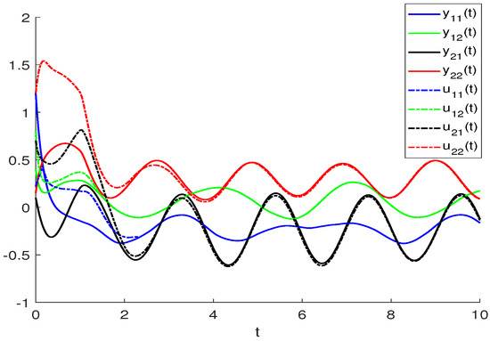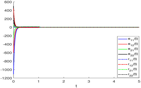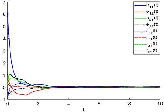 Similar to Example 1, we show the finite-time synchronization phenomenon of BAM neural networks using Figure 4, Figure 5 and Figure 6. We take Figure 4 as an example to explain the result. The solid and dashed line curve represent the real part of master and slave systems for BAM neural networks, respectively, i.e., the numerical solution in systems (3) and (4) under controllers (39)–(42). When , the numerical solution satisfies and when , i.e., the value of t is very large, the distance between and will equal to 0. Figure 6 shows this result better.