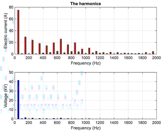 Figure 3 depicts the current and voltage harmonics of the waveform depicted in Figure 2. These values were obtained through the use of an FFT. These harmonics had excessively high values, particularly in the case of the current harmonics.