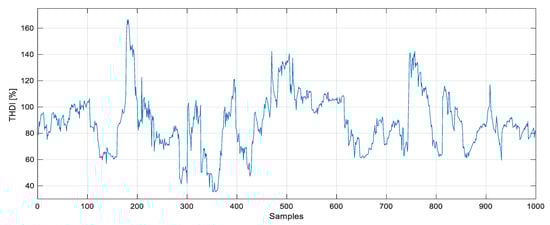 The THD values of the current were determined over a longer time in order to make a complete and consistent analysis of the variation of the total harmonic distortion. For this, data was recorded at a frequency of 5 kHz, and the THD frequencies of the current were calculated using this data. Figure 4 depicts this. This determination was made for a time interval of approximately 16 min. Every 1 s, a sample was calculated. The THD varied significantly depending on several factors.