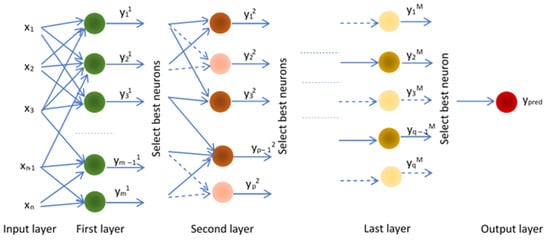 Applications of GMDH include data mining, prediction, modeling of complex systems, optimization, and pattern recognition [48]. This methodology is also known as a polynomial neural network, which is a machine learning method. The GMDH is a meta-heuristic method that can be utilized in conjunction with other techniques, such as genetic algorithms, particle swarm optimization algorithms, the fuzzy method, backpropagation, and the Levenberg–Marquardt method [49].