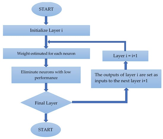 The neurons in this layer are trained, and neurons that fail to meet the minimum requirements are eliminated after training. After calculating the coefficients, the algorithm evaluates the performance and eliminates the neurons with the worst results. A method is used to evaluate the performance of a neuron that is based on an imposed minimum error defined by Equation (5) [50].