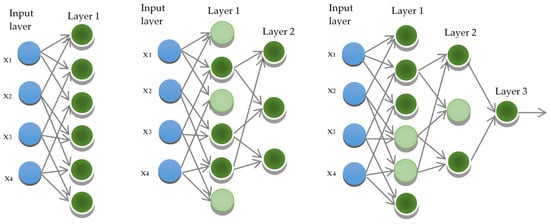 The training process is depicted as a logical diagram in Figure 6. Figure 7 depicts an example of the GMDH ANN architecture with four inputs and three layers. Low-performance nodes are colored lighter in Figure 7 and removed. When the last layer has a single node, the training stops.