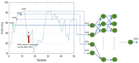 A model incorporating the GMDH and the experimental THDI measurements was created. The model was used for the GMDH ANN training with the values of the THDI at time-delayed moments. In fact, the THDI samples represented in Figure 3 were used for training, as shown in Figure 6. Matlab was used to create the simulations, which were then compared with the experimental measurements. The following network parameters were used to train the GMDH ANN: