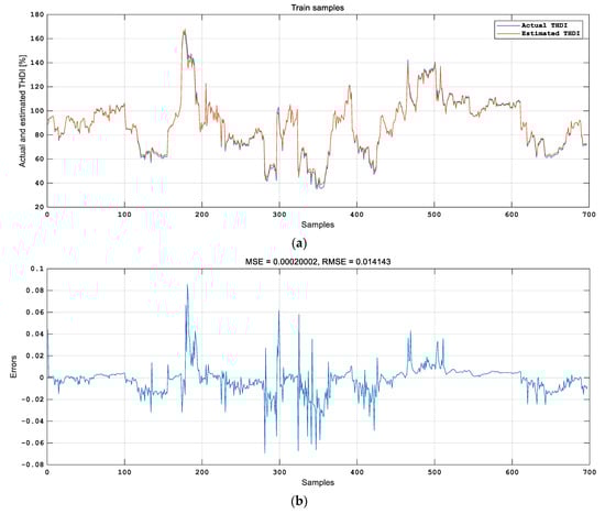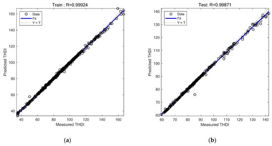 The prediction of current harmonics produced by nonlinear loads was also used in the study [52]. Although the study focused on the prediction of individual current harmonics (5th, 7th, 11th, and 13th harmonics), the authors also performed THD prediction. In [52], all harmonics up to order 40 were considered, as in our work. Estimates were made in 10 min (for comparison, we used determinations for an approximate duration of 16 min), and six ANN architectures from the MLPNN category were used (with varying numbers of hidden layers and neurons on layers). In the study [52], the authors calculated the regression coefficient for individual harmonics to be between 0.86 and 0.96, and for THD to be 0.8827. According to Table 1, our study, which employed ANN-GMDH, determined these measures, among other parameters, and the regression coefficient had a value of at least 0.99312 for the testing. This regression coefficient value is higher than the value from [52], demonstrating that our method had better performance.