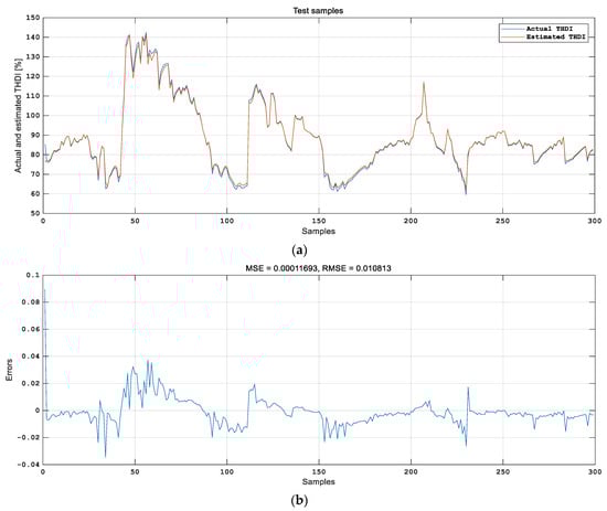 THDI variation (a) and errors variation (b) for testing data for the following parameters: nMax = 16, maxL = 6, α = 0.5, m = 5, and pTrain = 70%.
