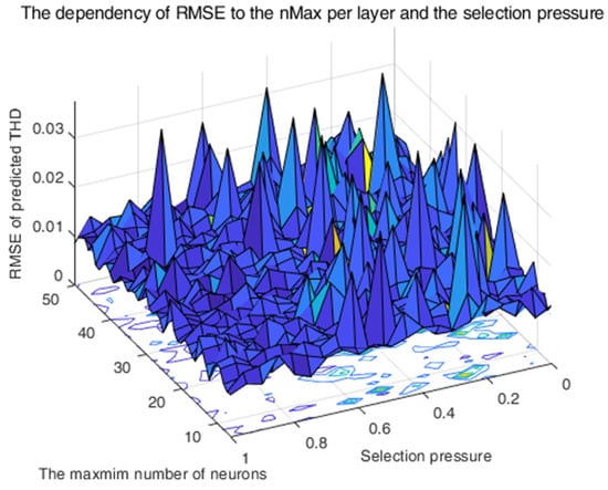 Figure 15 and Figure 16 depict the RMSE value as a function of the model parameters. Thus, in Figure 15, the RMSE value is represented as a variation in selection pressure ranging from 0 to 1 and a maximum number of neurons on a layer ranging from 10 to 50. Figure 16 depicts the RMSE as a function of selection pressure and the number of layers allowed to be added, with a maximum of 10 neurons per layer accepted.