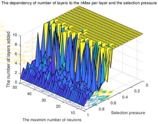 The dependency of the maximum number of layers added on the maximum number of neurons per layer and to the selection pressure coefficient.
