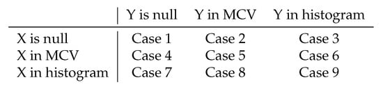 For join selectivity estimation, since there is the need to combine statistics from null values, MCVs, and equi-depth histograms for both X and Y, there are nine cases that need consideration, depending on the combination of the values of X and Y, as shown in Figure 5.