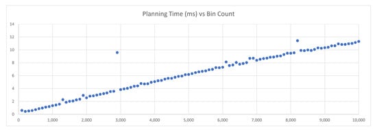 Query planning time (ms) vs. the number of histogram bins in Algorithm 2.