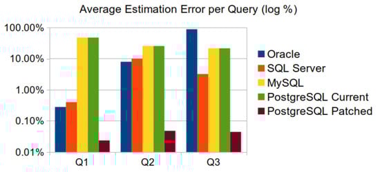 Figure 9 shows the average estimation error for each query, as returned by the tested DBMS. Our solution is denoted as PostgreSQL Patched. Note that we used a logarithmic scale for the y-axis; otherwise, our solution would not be visible on the graph. As we can see, the results for MySQL and the existing PostgreSQL solution were equally bad. This was expected, as both system returned a constant selectivity of for all queries. Oracle and SQL-Server returned better estimates for Query 1 (below 0.5% error), but struggled with the normal and Zipfian distribution. Our estimator consistently computed fairly accurate estimates for all data distributions, with average estimation errors of 0.02%, 0.05%, and 0.04% for Q1, Q2, and Q3 respectively.