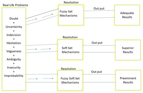 The fuzzy soft set-valued maps in Example 1 can be visualized as in Figure 3. We present in Figure 4, further schematic diagram to show the preeminence of applying fuzzy soft sets in decision-making mechanisms. As a matter of extension, the role of fuzzy soft sets, as depicted hereunder, is also inherited by fuzzy soft set-valued mappings.