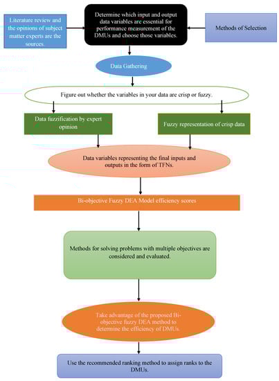 - The optimal solution obtained in Step 4 of the BOFDEA model, represented by the best weights, can be used to calculate the efficiency of each decision-making unit (DMU). The DMUs can then be ranked in decreasing order of their efficiency scores, determined by the - values. The ranking is performed from 1 to n, with 1 being the most efficient DMU and n being the least efficient . Schematic diagram for efficiency evalution of DMUs is presented in Figure 1.