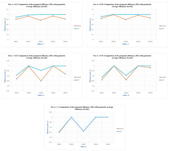 Wang et al. [7] proposed a geometric average ranking approach based on -cuts to rank the DMUs in the Fuzzy environment (Figure 2). The proposed study compared with the efficiencies calculated by Wang et al.’s [7] geometric average technique efficiency approach of DMUs. The comparison of efficiency scores and rankings is presented in Table 3. It can be observed that the rankings of DMUs obtained from both methods are different. In this case, it is difficult to compare both models. In order to compare both models, the coefficient of variation method [25] is applied. The coefficient of variation (CV) is a relative measure of dispersion that does not take into account dimensions and is calculated as the ratio of the standard deviation to the mean. The CV allows comparisons to be made between different data sets that are not possible using any other method. A coefficient of variation (CV) that is high indicates that there is a greater degree of data dispersion around the mean. A distribution with a lower coefficient of variation (CV) is considered to be more trustworthy than one with a larger CV. A CV comparison is presented in Table 4. From Table 4, it is concluded that the proposed methodology is more powerful and effective in ranking DMUs.