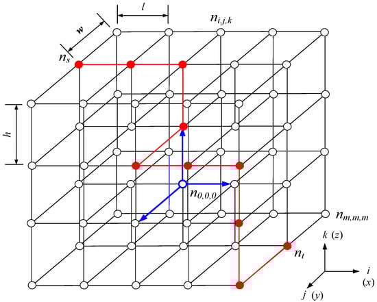 In the proposed model, the signal propagates strictly along the straight line connecting the observation point with the node ni,j,k. Then the number of obstacles in this direction is equal to the number of intersected vertical and horizontal planes drawn through the centers of the ribs connecting the lattice nodes, i.e., the sum of the absolute values of the indices i, j, and k. Thus, Equation (6) can be modified as follows.