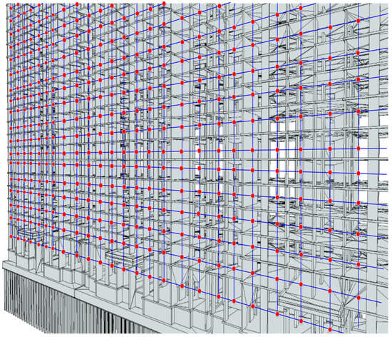 In order to analyze the functioning of the network within the entire building, we should ensure the possibility of interaction between nodes located in different rooms. However, all nodes in the same room can be considered as a single node due to the small, closed line-of-site distance between them. Let’s assume that the structure of the building consists of identical rectangular rooms, which in most cases, fit the real situations. A rectangular lattice can describe the structure of the network within the boundaries of the building, as presented in Figure 1. The nodes of the lattice are the nodes of the network and the connection edges between them [23]. Figure 2 presents a simple layout of network nodes in a multi-story building according to the proposed model.