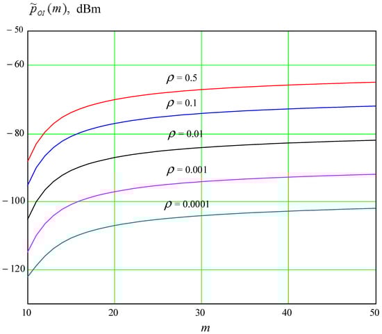 Considering Equations (5) and (6), Equation (2) can be written in terms of the indices of the lattice nodes. The lattice is regular and symmetric with respect to the observation center. Therefore, only positive values of the indices can be considered, i.e., 1/8 of the lattice, by introducing the corresponding factor into the expression without loss of generality. The threshold level of the power, pm, is maintained to the receiving point, above which the signal is not perceived as interference. Then, the expression for the interference power at the observation point can be written as follows.