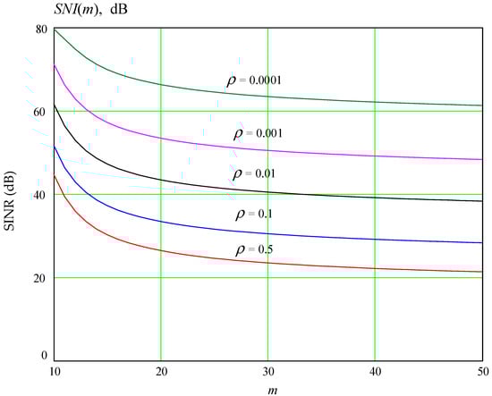 Numerical results of Figure 4 indicate that, at close to real values of the number of nodes and traffic intensity, the SINR for neighboring nodes of the lattice takes a value of at least 20 dB, which in most cases allows ensuring a sufficiently high quality of the radio channel. This value of SINR is achieved for near-real situations in the case of the number of deployed nodes and the traffic intensity. For example, it is possible to operate at the maximum speed when using the IEEE 802.11ac standard with this SINR value [24,25].