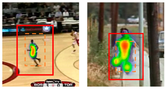 The PAM has two functions: one is to get a better positive sample into the trainer for training; another is to strengthen the feature and improve the ability to express the feature. To fully exploit the advantages of the PAM module in the tracking phase, we propose the Acc branch, which can optimize the scores generated by other branches through the joint classification–regression alternating refinement method from SiamOA [37]. In this branch, our tracker adopts the strategy of this paper [40]. The ideal result of the Acc branch is shown below: