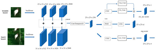 As shown in Figure 2, the feature extracted network has two similar branches with the same parameter. The front is the search branch, and the bottom is the template branch. The PACR adopts the feature from layer 2, layer 3, and layer 4 of resnet50. The feature score will be obtained after the inverse convolution of the feature map, which is calculated by combining the feature extracted from the prior network. We adopt a novel design idea in the following classification prediction network. During the training and tracking phase, the PACR adopts two similar but not identical networks to ensure that our network has a high training speed and can also ensure that the performance of tracking is not significantly affected; the Acc branch was uniquely proposed to improve the regression results.