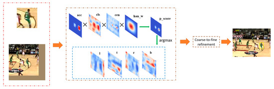 is the cosine window, is a super-parameter, and the combination of these can suppress large changes in the bounding box and position. is a penalty updated with the search frame changed. After the coarse position is obtained, the accurate position will be calculated in a coarse-to-fine refine strategy [29]. is a vector of with each subvector representing the distance from the corresponding position to the four sides of the bounding box. So the height and width of the predicting box can be performed as follows: