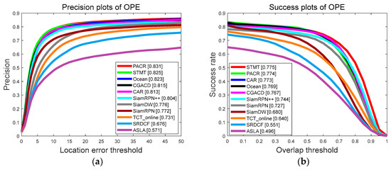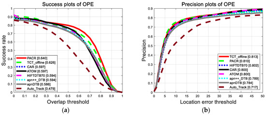 As shown in Figure 9, compared with TCTrack, the state-of-the-art UAV tracker in 2022, our tracker improves by 1.4% in success and decreases by 0.3% in precision. PACR has 55 FPS in this dataset which is much faster than TCTrack. Compared with CAR, our tracker obtains a 4.3 percentage point increase and one percentage point increase, respectively, in success and precision.