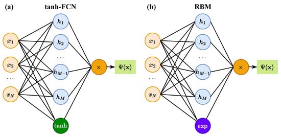 In the following, we will write as to stress its dependence on the variational parameters and that it is interpreted as a wave function instead of a probability distribution. We will also refer to our neural network in Equation (4) as tanh-FCN since it contains a fully connected layer followed by hyperbolic tangent as the activation function. The difference between RBM and tanh-FCN is demonstrated in Figure 1.