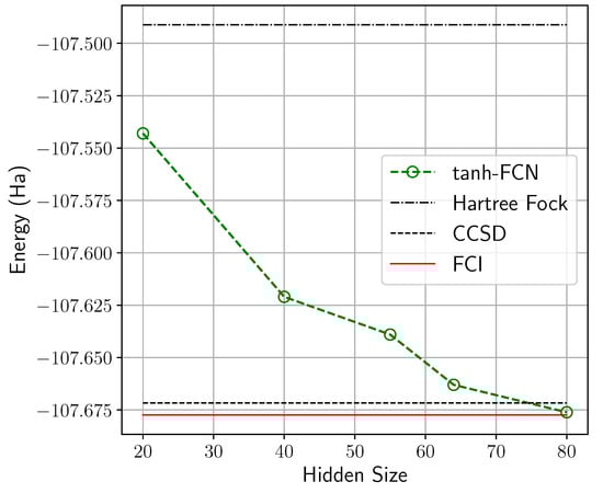 where and are one- and two-electron integrals in molecular orbital basis, and and in the Hamiltonian are the creation and annihilation operators. To treat the fermionic systems, we first use the Jordan–Wigner transformation to map the electronic Hamiltonian to a sum of Pauli operators, following Ref. [23], and then use our tanh-FCN in Equation (4) as the ansatz for the resulting many-spin system. The resulting spin Hamiltonian can generally be written in the following form: