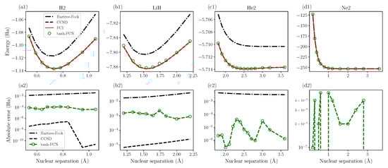 Potential energy surfaces of (a1) , (b1) LiH, (c1) and (d1) . We have used for , , and for LiH, which are sufficient for our tanh-FCN to reach chemical precision. We have also used for both molecules during the training. (a2), (b2), (c2) and (d2) show the absolute error with respect to the FCI energy for , LiH, and respectively. We have used the STO-3G basis set for , LiH and , and the 6-31G basis set (using a (2e,4o) active space) for .