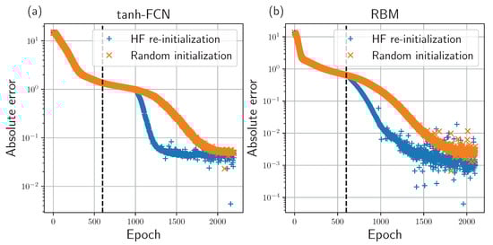 There are generally two ingredients which would affect the effectiveness of the NNQS algorithm: (1) the expressivity of the underlying neural network ansatz and (2) the ability to quickly approach the desired parameter regime during the VMC iterations. The former is dependent on an intelligent choice of the neural network ansatz. The effect of the latter is more significant for larger systems, and one generally needs to use a knowledged starting point such as transfer learning [41,42] for the VMC algorithm to guarantee success. For molecular systems, it is difficult to explore transfer learning since the knowledge for different molecules can hardly be shared. However, for molecular systems the Hartree–Fock reference state may have a large overlap with the exact ground state and is often used as a first approximation of the ground state. Here, we show that for quantum chemistry problems the ability to reach faster the ground state can be improved by using the knowledge of the Hartree–Fock reference state. Concretely, during the VMC iterations, after the energies have become sufficiently close to the ground state energy, we stop using random initialization for our Metropolis–Hastings sampling and use the Hartree–Fock reference state instead (Hartree–Fock re-initialization). The effect of the Hartree–Fock re-initialization is demonstrated in Figure 4, where we have taken the H2O molecule as our example. To show the versatility of the Hartree–Fock re-initialization, we demonstrate its effect for RBM as well. We can see that for both tanh-FCN and RBM, using Hartree–Fock re-initialization after a number of VMC iterations can greatly accelerate the convergence and reach a lower ground state energy than using random initialization throughout the VMC optimization. We can also see that for the H2O molecule, tanh-FCN is less accurate than RBM using the same , which is probably due to the fact that under the same , tanh-FCN has a different expressive power to RBM for H2O.