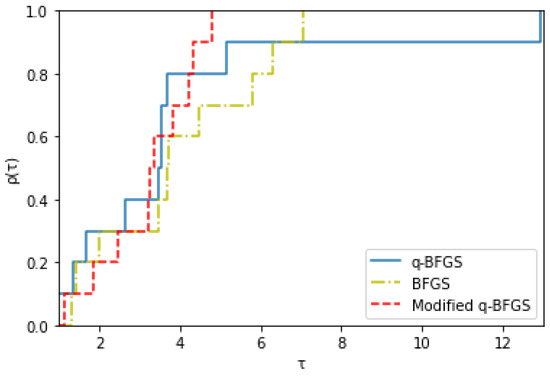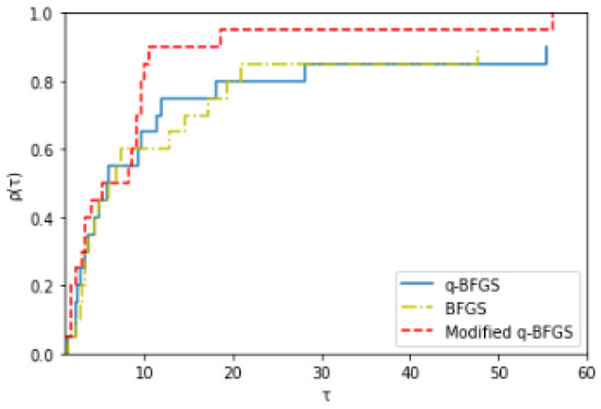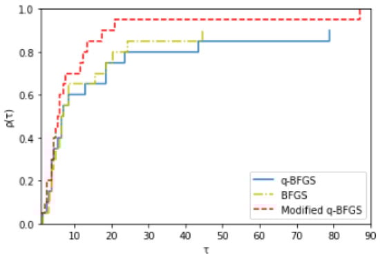 Table 5, Table 6, Table 7, Table 8 and Table 9 show that the modified q-BFGS algorithm solves about 86% of the test problems with the least number of iterations, 82% of the test problems with the least number of function evaluations, and 52% of the test problems with the least number of gradient evaluations. Therefore, with Figure 16, Figure 17 and Figure 18 we conclude that the modified q-BFGS performs better than other algorithms and improves the performance in fewer iterations, function evaluations, and gradient evaluations.