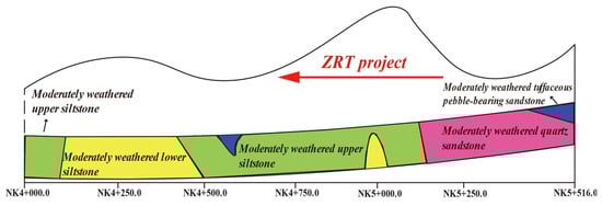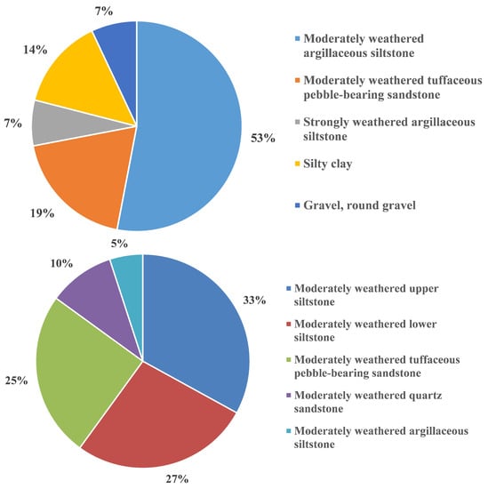 Based on the geological engineering investigation report, the tunnel geology of the entire west section is primarily composed of extremely soft and soft rock, where moderately weathered argillaceous siltstone accounts for approximately 53% and moderately weathered tuffaceous sandstone accounts for about 19%. In the east tunneling excavation section, hard rock predominates, including moderately weathered siltstone accounting for 60% and moderately weathered quartz sandstone accounting for 10% (Figure 2).