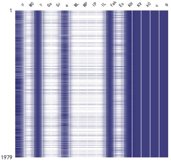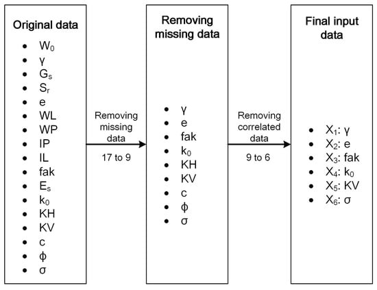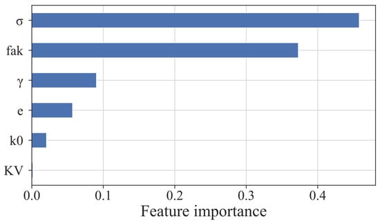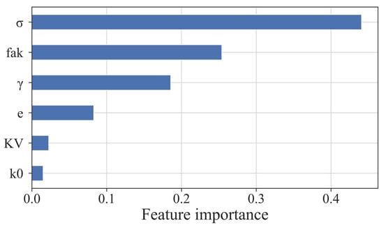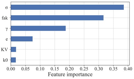 It is clear from Figure 7 that any of the nine features recovered exhibit a high degree of association. The nine datasets will again be shrunk in dimension to avoid features with strong correlations that would have a significant impact on the obtained prediction. It is demonstrated that there is a strong correlation between the cohesion and bearing capacity (0.86), natural density and friction angle (0.95), and horizontal and vertical permeability coefficients (1.00). Consequently, we only need to reserve one of the mentioned pair of geotechnical parameters. In practice, the natural density and bearing capacity are important geological parameters according to experts and need to be reserved. By reserving the vertical permeability coefficient, nine parameters are reduced to six for the variable importance analysis by random forest. Figure 8 displays the final data preparation after reductions from 17 to 6 geotechnical input parameters for the model training. Each of the input data contains 1979 sets.