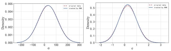Distribution of original data and that treated by the KNN algorithm of compressive strength () (left subfigure) and void ratio () (right subfigure).