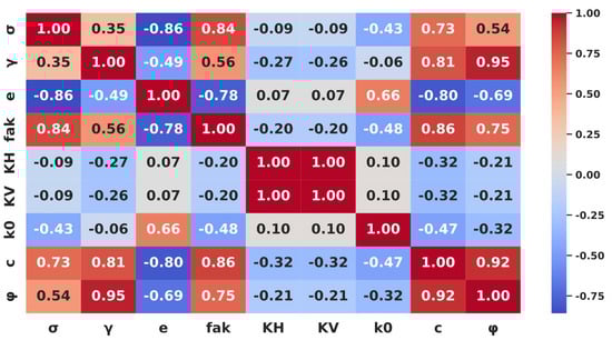 Moreover, in the random forest program, the performance of the random forest model will get worse if the degree of correlation between involved geotechnical parameters is greater. In order to improve the accuracy of the random forest procedure, the collected geological data also need to be analyzed for the correlation coefficient. Consequently, the correlation matrix is used to display the correlation coefficients among all the geological parameters, before being implemented in the program. The heat map (Figure 7), also known as the correlation coefficient map, can visually judge the magnitude of the correlation between variables based on the color of different squares on the heat map. The correlation coefficient can be calculated directly by the following formulation: