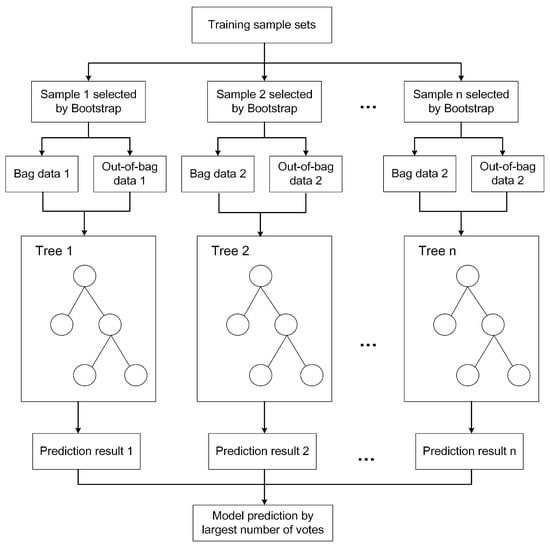 The Random Forest algorithm [33] is a classification algorithm composed of multiple decision trees, with each tree producing a category that contributes to the final output category. It is built using the bagging method and categorical regression trees and has been successfully used in various disciplines (see Figure 9). Random forests consist of different decision trees that are independent of each other. When a sample is inputted, each tree in the forest will make a decision and vote to determine the best category. Typically, features are used in each split for classification problems with p features. However, each problem requires tuning to identify the best values for these parameters.