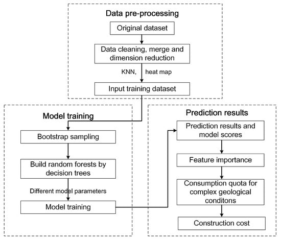 In this study, we have proposed a random forest-based machine learning procedure to analyze the construction cost of shield tunneling in complex geological conditions. We identified the unit consumption of grease, grouting, labor, and water and electricity as the main factors affecting construction cost, based on engineering practice and expert opinions. To improve the accuracy of the model, we replenished empty and abnormal values in the input datasets and reduced its dimensionality from 17 to 6 using KNN and correlation analysis.