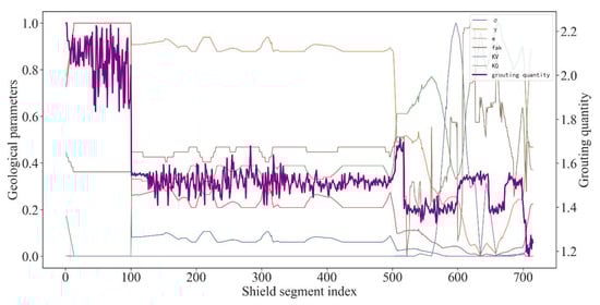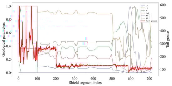 Inspired by Santos et al. [47], we have plotted the six geological parameters and the quantity of material consumption in the same order of shield segment in Figure 11 and Figure 12. To avoid repetition, we will only discuss tail grease (red curve in Figure 11) and grouting (purple curve in Figure 12). The values of the geological parameters have been normalized using Equation (10). It is observed that the different geological conditions in the excavation area can be reflected by the variation of geological parameters, and there is a correlation with material consumption. However, the most important geological feature and exact relation cannot be directly seen and need to be analyzed using the constructed random forest model.