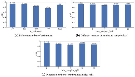 We take the Gini index as a measure to show the calculation of variable importance. Considering n categories, the weight of the k-th category can be computed from Equation (6). For feature j, the change value of feature j at node m () is obtained as: